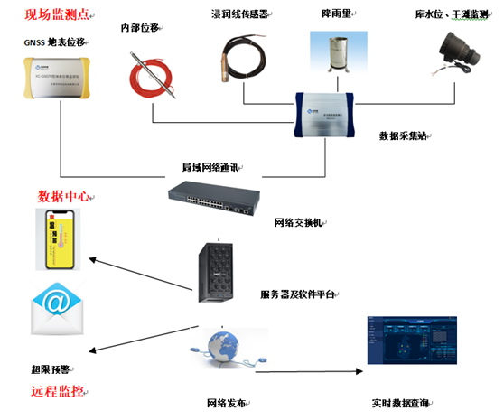 尾礦庫在線監(jiān)測系統(tǒng)主要由現(xiàn)場傳感器、數(shù)據(jù)采集站、現(xiàn)場數(shù)據(jù)傳輸網(wǎng)絡(luò)、供電系統(tǒng)、防雷系統(tǒng)、監(jiān)測預(yù)警平臺軟件組成。